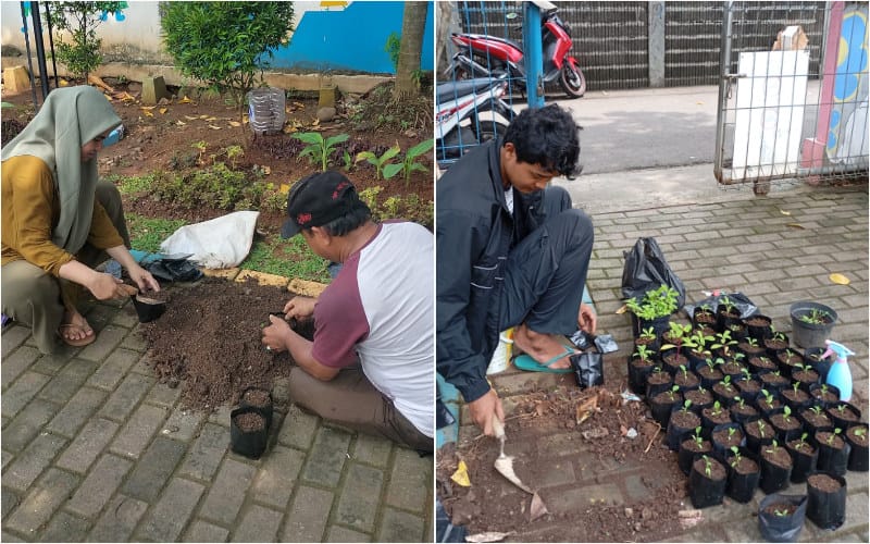 Kiri: Pengelola sedang menyiapkan media tanam untuk menanam terong. Kanan: Pengelola sedang menanam terong. Penanaman dilakukan pada hari Senin, 3 Maret 2025.